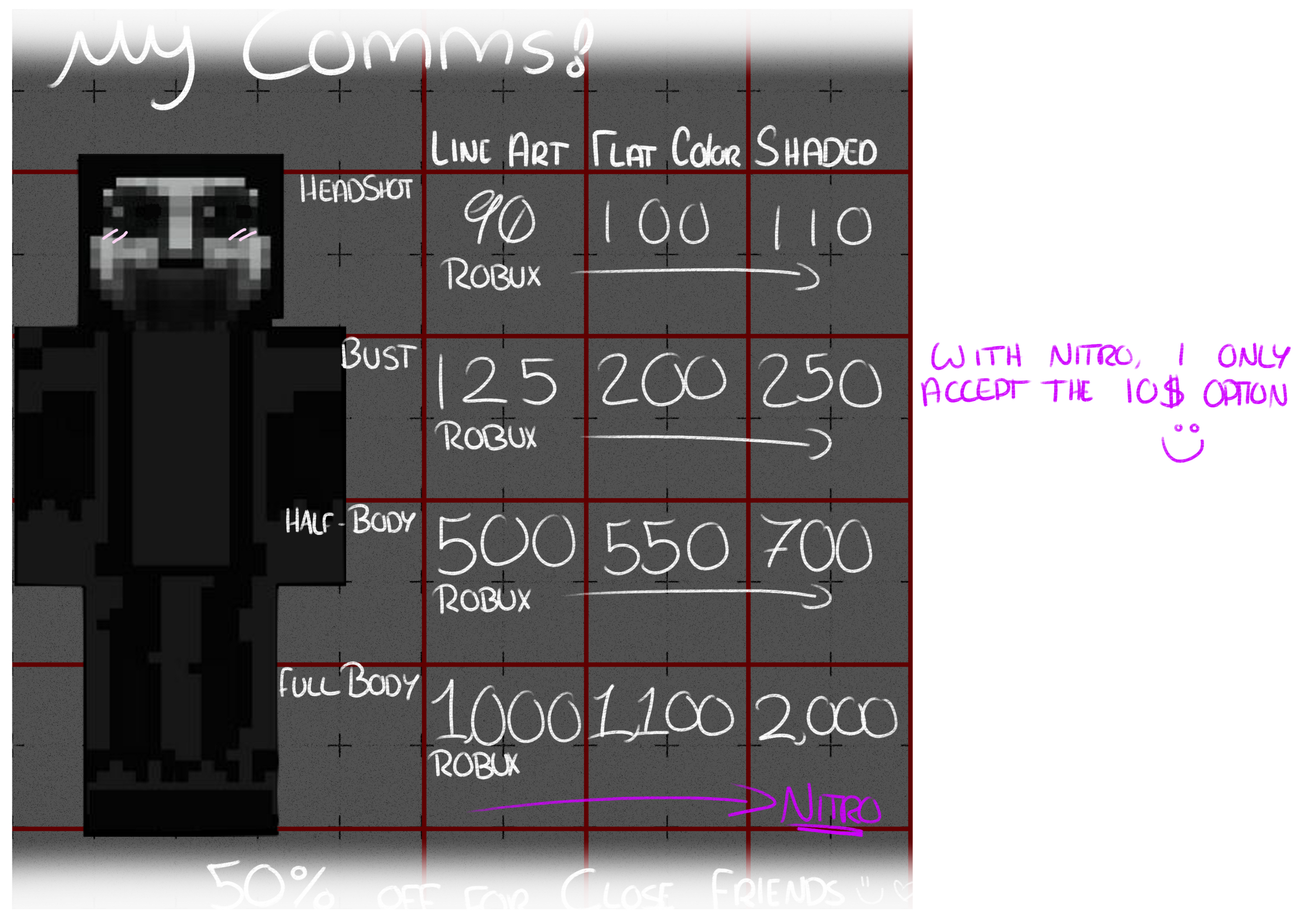 Banners, Full body, Busts, PFPs, Emojis (1-5 at a time), etc. Don't see what you want here? Ask me!i will NOT do :
